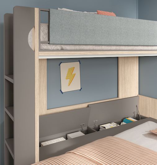 Cama alta de 90 x 190 y cama baja de 135 x 190 con cajones y trampillas, y no te pierdas el armario con hueco y espejo lateral. En tienda podrás ver el resultado con nuestro programa 3D. ¡Te esperamos! Y ahora con transporte y montaje incluidos*