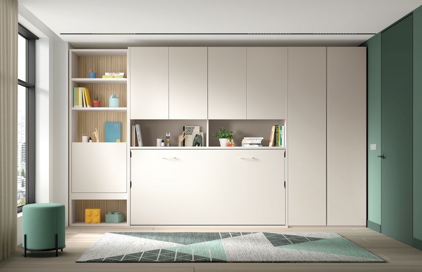 Cama abatible horizontal con librería interior, librería superior con puertas, librería lateral con mesa abatible y armario lateral, una habitación completa en el mínimo espacio. Ahora con transporte y montaje incluidos*