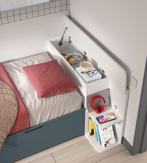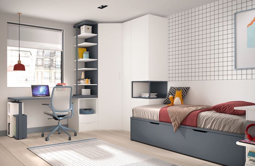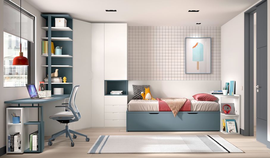 Cama nido con base extraíble, original arcón con tapa superior y estantes, armario de rincón y zona de estudio, toda una habitación en el mínimo espacio. Todas las piezas se hacen a la medida para adaptarnos al espacio disponible, y muchos colores para elegir.