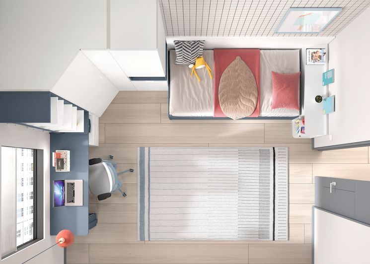 Diseño 3D para habitaciones juveniles, decoración, acabados con colores y texturas reales.