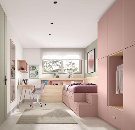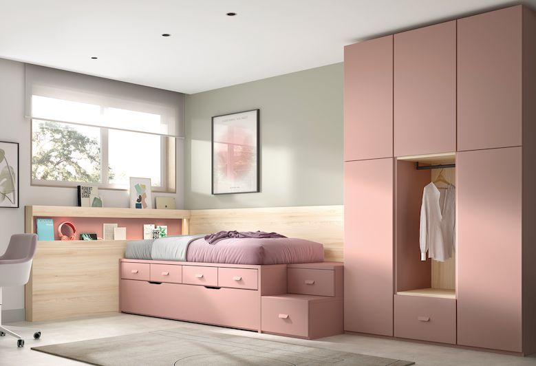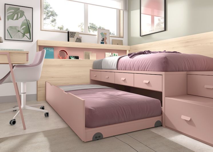 Cama baja extraíble con cajones, armario y zona de estudio. Muebles muy originales que te sorprenderán. Elige los colores y en tienda podrás ver tu habitación con nuestro programa 3D . ¡Te esperamos! Ahora con transporte y montaje incluidos*