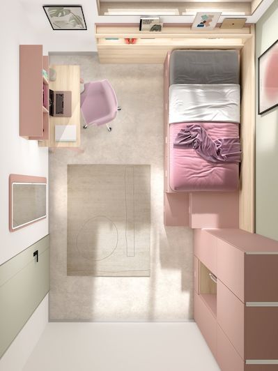 Diseño 3D para habitaciones juveniles, decoración, acabados con colores y texturas reales.