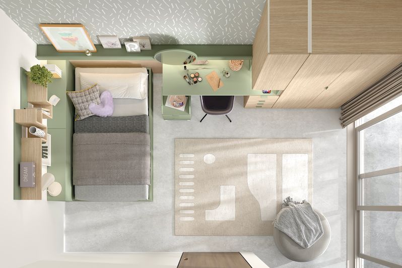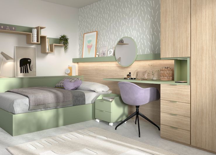 Diseño 3D para habitaciones juveniles, decoración, acabados con colores y texturas reales.