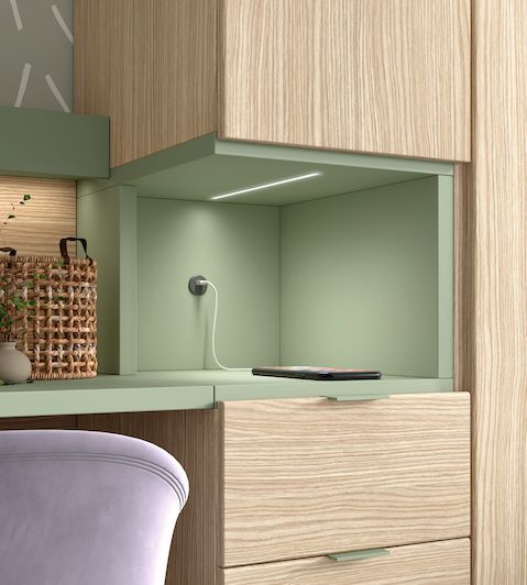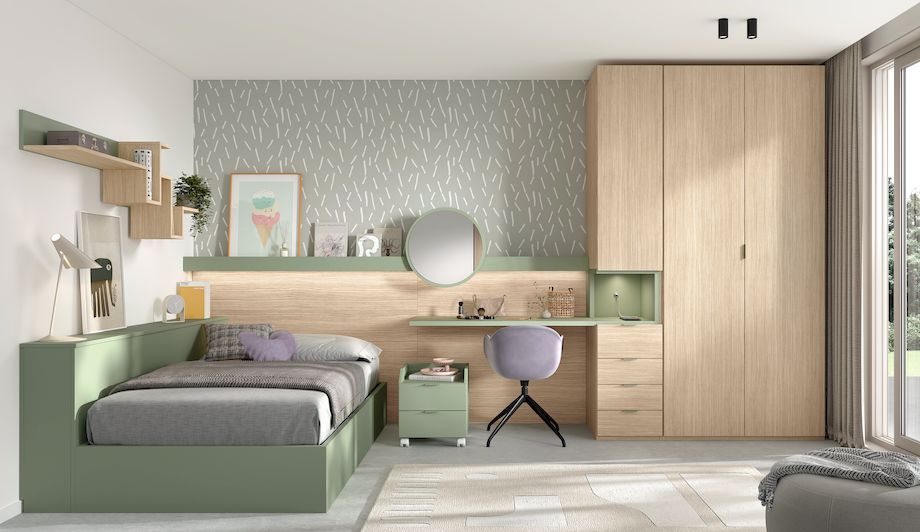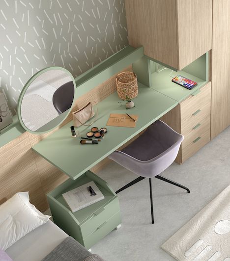 Canapé de apertura lateral, arcones con tapa superior, original armario con hueco lateral abierto y mesa de estudio enrasada con el hueco del armario. Todas las piezas se pueden adaptar a la medida disponible, y con muchos colores a elegir.
