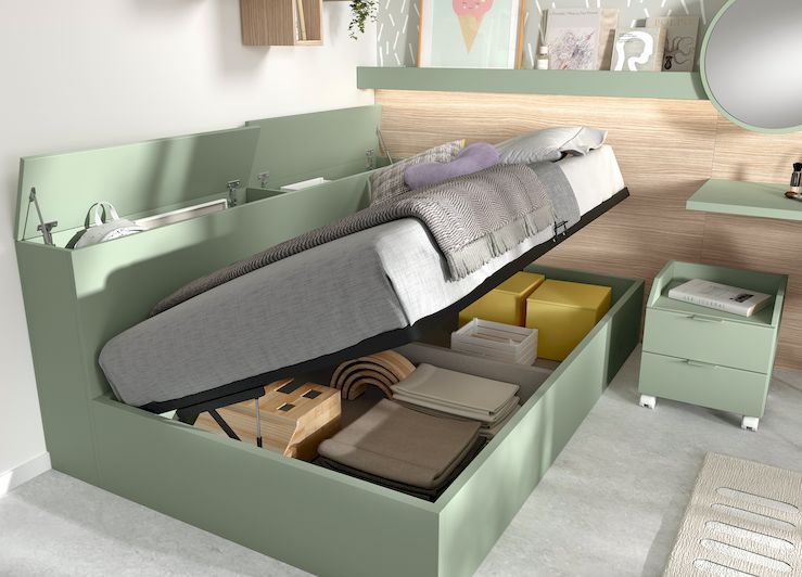 Canapé de apertura lateral, arcones con tapa superior, armario con hueco lateral abierto y mesa de estudio enrasada con el hueco del armario. Original habitación que podemos hacer a la medida. En tienda podrás ver el resultado con nuestro programa 3D. Ahora con transporte y montaje incluidos*