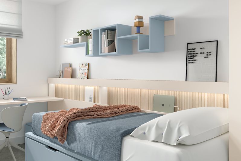 Cama con cama extraíble y cajones grandes, panel revistero con luz led, armario y zona de estudio. Tráenos tu plano y en tienda podrás ver tu habitación con nuestro programa 3D. Ahora con transporte y montaje incluidos*